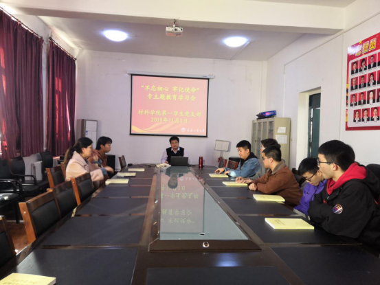 2019年10月12日,fc2av 学生第一党支部在材料楼五楼党建活动室召开““不忘初心,牢记使命”主题教育学习会,学生第一党支部全体党员参加了会议,学生党支部书记万杨主持会议。