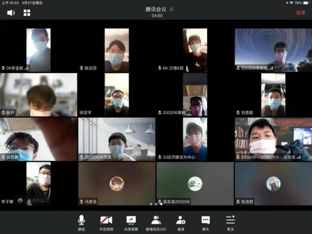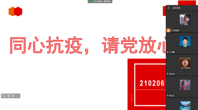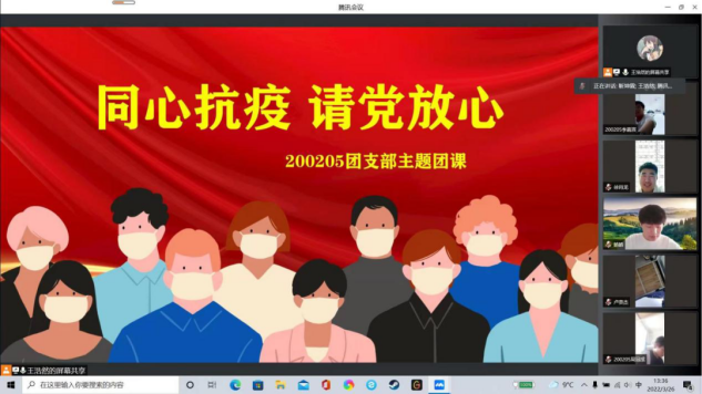 2022年3月26日,200205班在线上开展了“同心抗疫,请党放心”主题团课。会议第一项:奏唱共青团团歌;会议第二项:由主持人王浩然为大家介绍了近期长春市疫情局势的严峻,并且讲述了我们在宿舍里要如何最好防护,例如尽量减少出寝室的次数,出门戴好口罩和落实一天三消毒三通风;会议第三项:请志愿者邵傲博为大家介绍一直以来志愿者的工作和老师们的工作。同学们深刻的意识到我们的安全来之不易,是靠老师们和同学们的辛勤付出维持的。会议最后主持人王浩然总结到:我们要团结一致对抗病毒,对志愿者和老师们怀有感恩之心,珍惜在校时间,加强计划打造健康和高效学习生活。