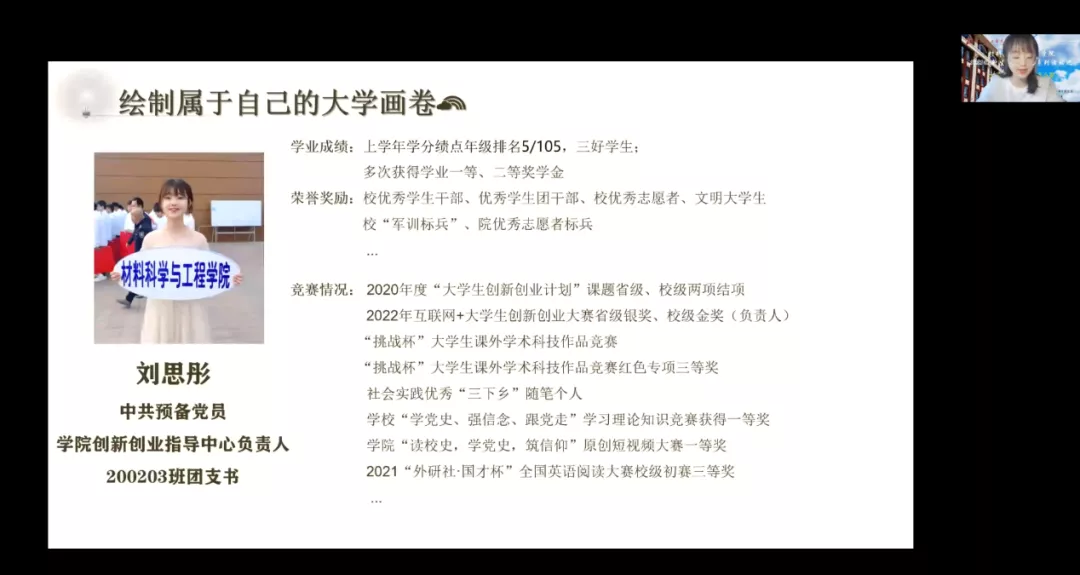 于线上召开“2022级新生教育系列活动”之十佳大学生经验分享会暨新老生交流会。本次大会由校十佳大学生刘星宇、陈洋,老生代表刘思彤共三位优秀学生主持,各位代表主要从学习经历,工作经验,参加相关竞赛等相关内容展开叙述,全体22级新生参加此次会议。
