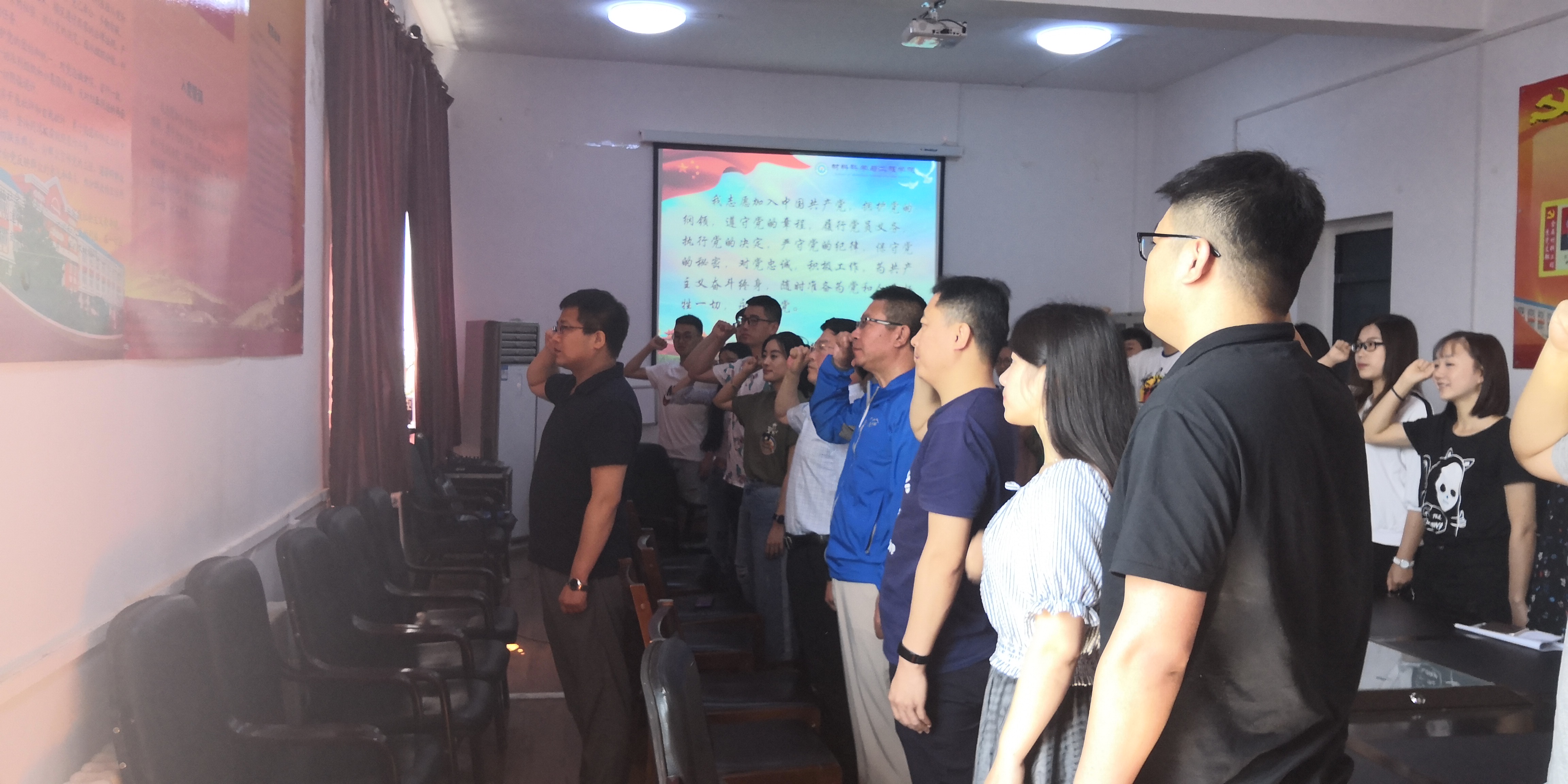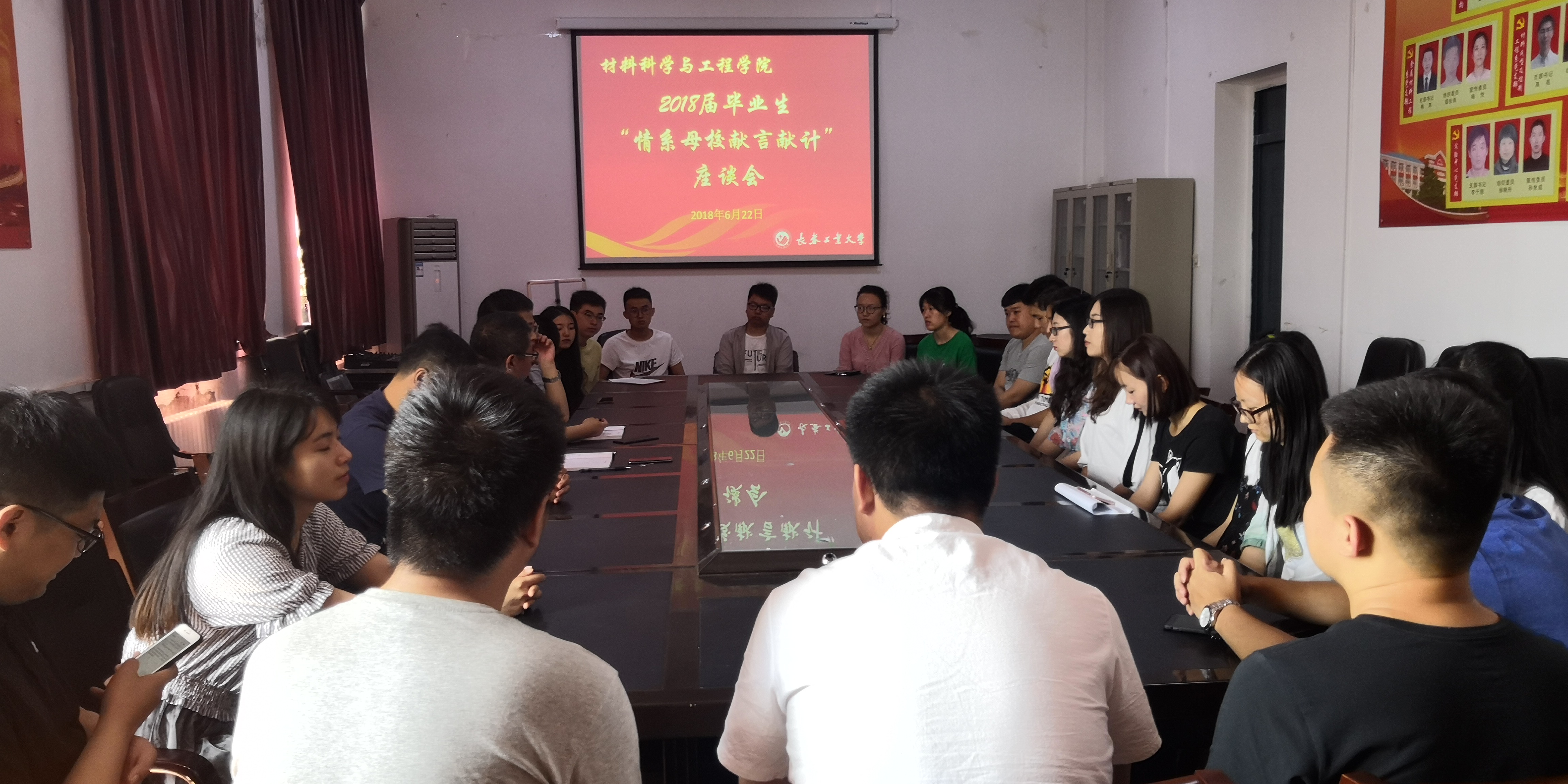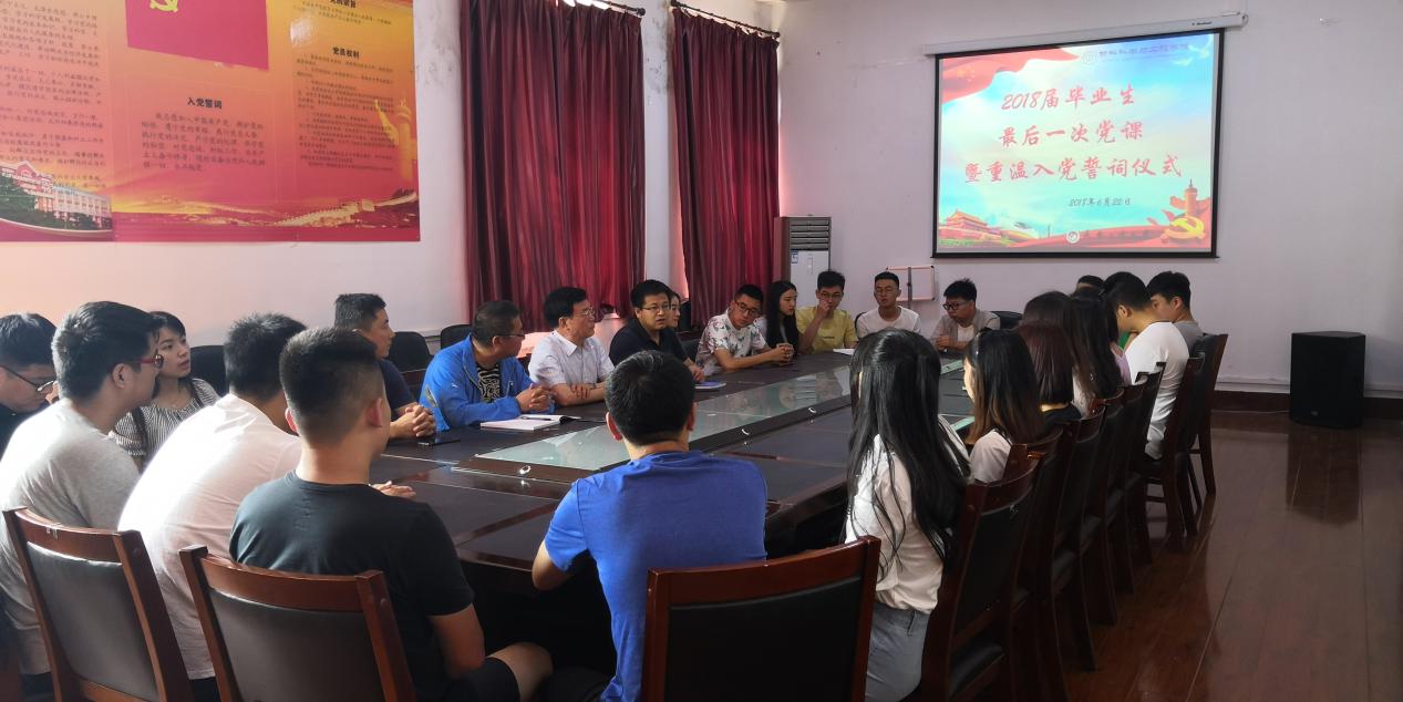 (通讯员:邹绍岩)2018年6月22日上午九时,学院党委在材料楼五楼会议室举办2018届毕业生最后一次党课暨重温入党誓词仪式和“情系母校献言献计”座谈会。本次会议由党支部书记万杨主持。党委书记兰民,副书记吴文东,党委专职组织邹绍岩,全体2018届毕业生党员参加会议。