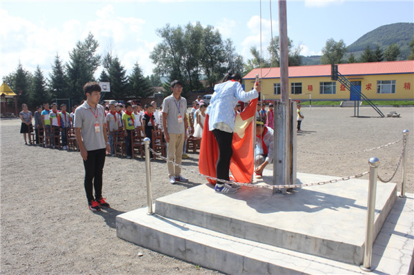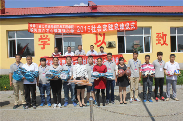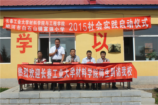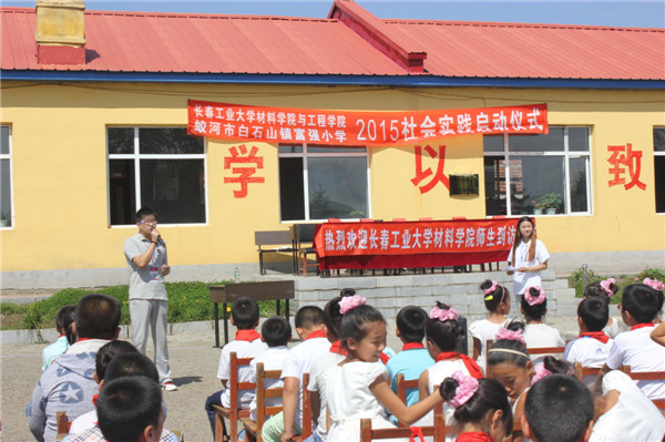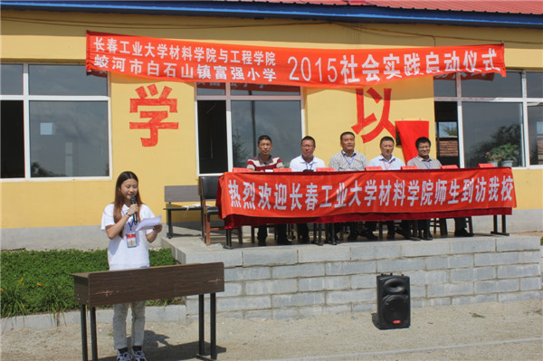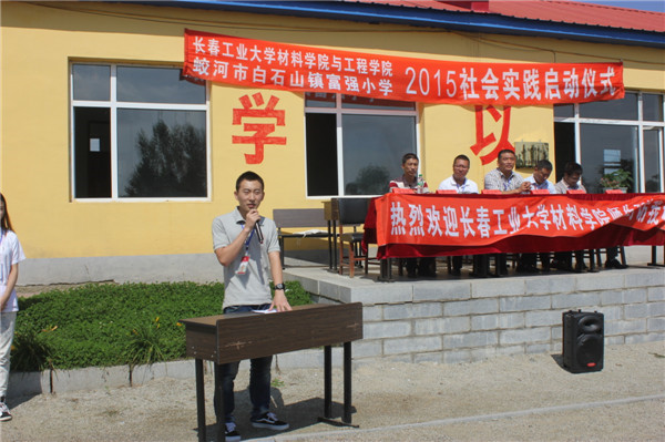 与蛟河市白石山镇富强小学社会实践活动启动仪式,出席仪式的嘉宾是学院党委书记夏天民、党委副书记吴文东、团委书记邹绍岩、学生党支部书记万杨,富强小学校长周建飞及富强小学全体师生、学院志愿者们,仪式由志愿者陈宇畅主持。