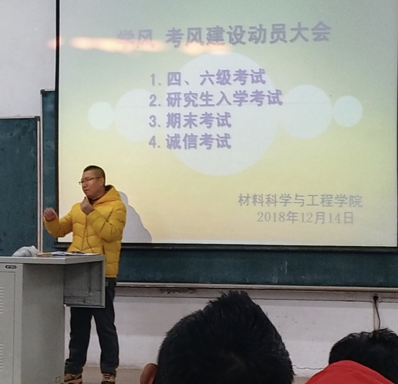 召开了18级学风考风建设大会,大会于2018年12月14日下午三点在北湖西阶102教室举行,大会由党委副书记吴文东主持,辅导员助理魏军虎出席会议,18级全体同学参加本次大会。