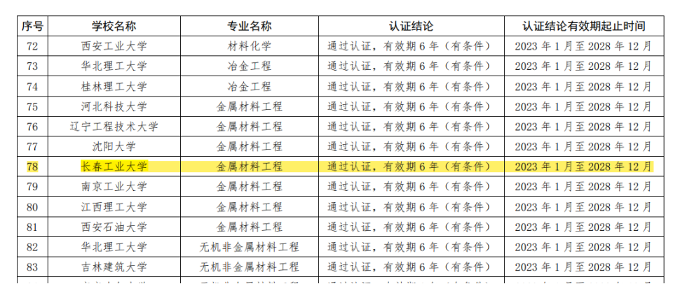 金属材料工程专业通过了国家工程教育专业认证,有效期6年(有条件),具体时间为2023年1月至2028年12月。此次认证通过,标志着金属材料工程专业的人才培养质量已达到国际实质等效的工程教育标准及要求。