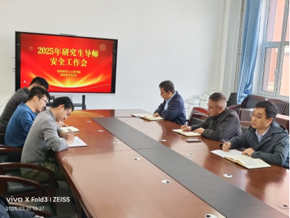 在材料楼425会议室召开2025年研究生导师安全工作会,学院党委书记张学忠、副院长朱巍巍、副院长李于朋、全院研究生导师参加会议。