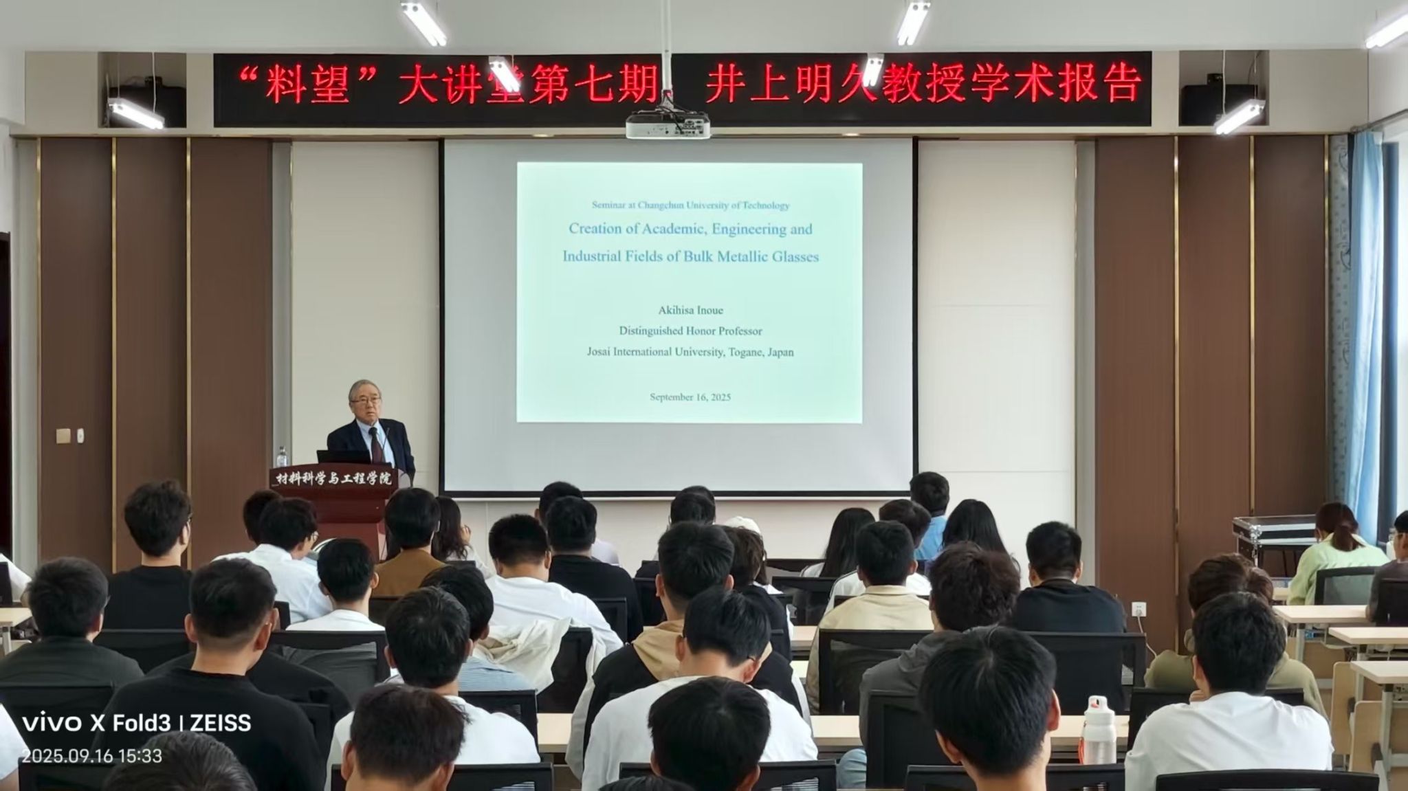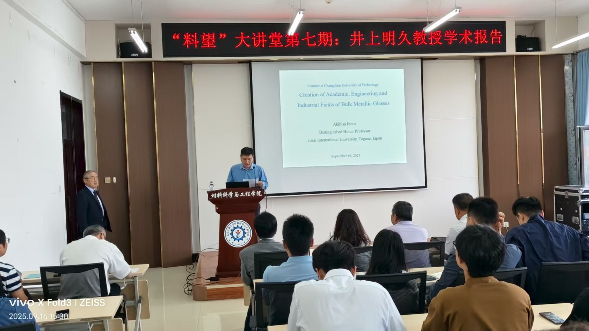 “料望”大讲堂系列学术报告第七期在材料楼417会议室举行。特邀诺贝尔物理学提名奖获得者、日本城西国际大学教授、博士生导师井上明久先生作专题报告。报告会由韩英院长主持,学院领导、相关领域企业负责人、部分青年教师、研究生参加了报告会。