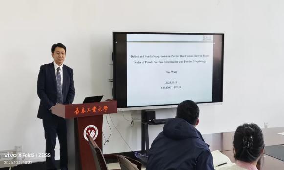 报告会上,王昊副教授概括介绍粉末形态对粉末流动性有着至关重要的影响,进而影响电子束粉末床熔融(EB-PBF)过程中粉末层的铺展均匀性。此外,还应用了介观尺度数值模拟来分析由两种粉末组成的粉末层的熔化过程,从而阐明了粉末特性在抑制 EB-PBF 制造的钴铬钼缺陷方面的重要性。此次报告会内容丰富且富有前沿性,引起了与会师生的广泛关注。
